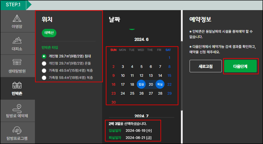 - 날짜 및 인원 설정: 이용하려는 날짜와 인원 수를 선택합니다.